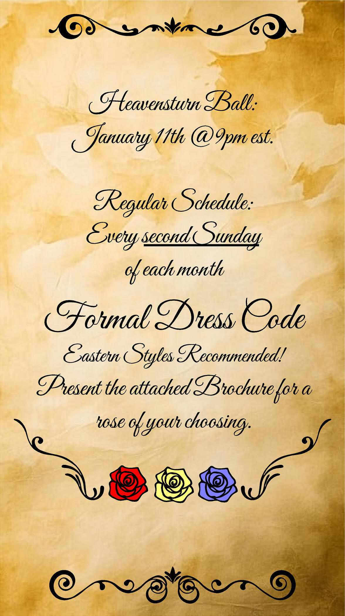 expression, not OOC.• Redeem these roses at the front desk when you arrive. There are in game items given out, and you may choose whether to wear the selected rose on your wrist or in your hair.• If you are coming to the Ball on a date, it is recommended each wears a Red Rose.